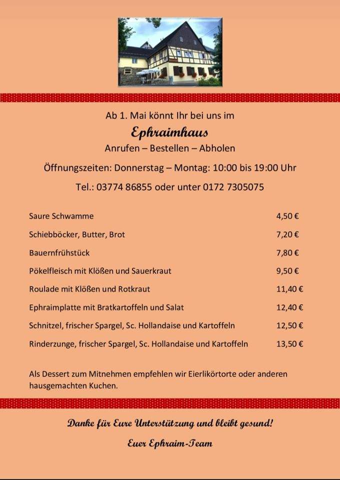 Warum gerade jetzt, inmitten des Corona-Gaststättenöffnungsverbots, ans Ephraimhaus denken? Peggy Lang, des Hauses liebreizendes Töchterlein, hat die Bestell- und Abhol-Speisekarte im Internet geteilt.